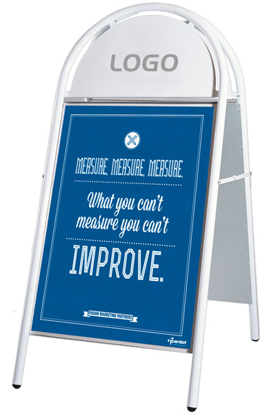Kundenstopper mit Logotop. Aus 25 mm Stahlrohr, phosphatiert under polyesterlackiert produziert. Rostfreie und unlackierte Alu-Zink Rückplatten. Entspiegelten APET Frontplatten mit Magnet.