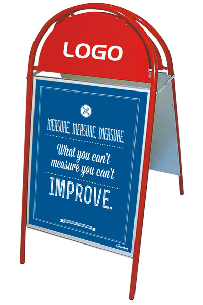 Kundenstopper mit Logotop. Aus 25 mm Stahlrohr, phosphatiert under polyesterlackiert produziert. Rostfreie und unlackierte Alu-Zink Rückplatten. Entspiegelten APET Frontplatten mit Magnet. Poster Größe: 59,4x84,1cm - A1Abmessungen: 68x140cmLogo Größe: 60x33cm rot - 59,4x84,1cm - 3474