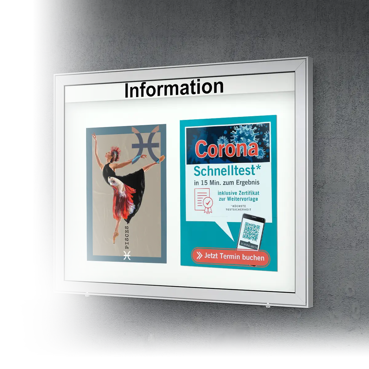 Wetterfestes Modell für großformatige Schaukästen im Außenbereich. Die Konstruktion aus stabilen Aluminium-Hohlkammerprofilen mit innen liegenden Eckverbindern geben diesem Schaukasten hohe Verwindungssteifigkeit und Stabilität. Geöffnet wird der Schaukasten per Klappflügel nach oben, unterstützt und sicher offen gehalten durch innen liegende Gasdruckfedern. Die Schließung erfolgt von unten über zwei Sicherheitsschlösser.Außenmaß: 980 x 830 x 65 mm (B x H x T) Sichtfläche: 850 x 610 mm | Nutzbare Innentiefe: 45 mm 8 DIN A4 Blätter können im Hochformat ausgehängt werden.  Verdeckt liegende Be- und Entlüftung gegen Beschlagen der Scheibe Günstiges Modell mit hervorragendem Preis-Leistungs-Verhältnis Absolut wetterfest, wartungsfrei und sicher abschließbarauf Wunsch auch in allen RAL-Farben erhältlichNutzerinformationen