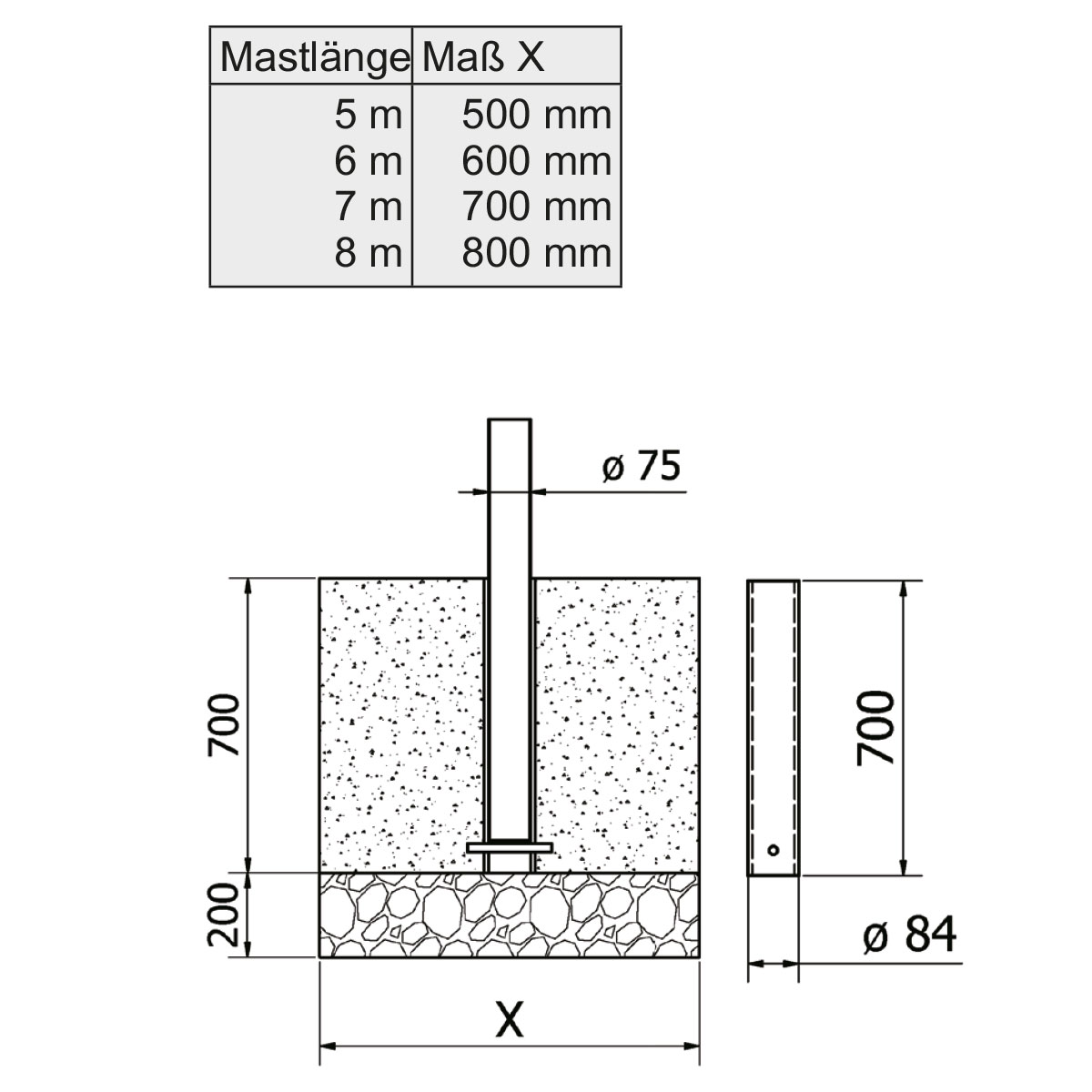Diese Bodenhalterung ist sehr gut für unser Modell "Economy" mit nicht hißbarem Drehausleger geeignet, da der Mast aus dieser Halterungen zur Fahnenmontage sehr leicht heraus genommen werden kann, bitte berücksichtigen Sie jedoch, dass dadurch der Mast gegen Vandalismus bzw. Diebstahl nicht geschützt ist.